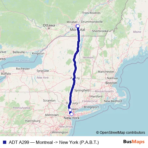 The first stop of the ADT A299 bus route is Montreal and the last stop is New York (P.A.B.T.). ADT A299 (Montreal -> New York (P.A.B.T.)) is operational during tous les jours.