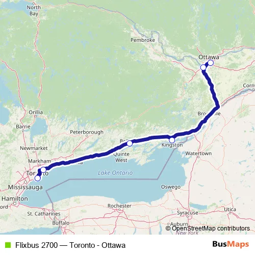 The first stop of the Flixbus 2700 bus route is Toronto (Union Station Bus Terminal) and the last stop is Ottawa (VIA Rail). Flixbus 2700 (Toronto - Ottawa) is operational during tous les jours.