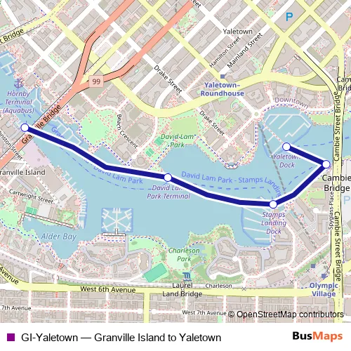 The first stop of the GI-Yaletown ferry route is Yaletown and the last stop is Granville Island Aquabus Ferry Dock. GI-Yaletown (Granville Island to Yaletown) is operational during tous les jours.