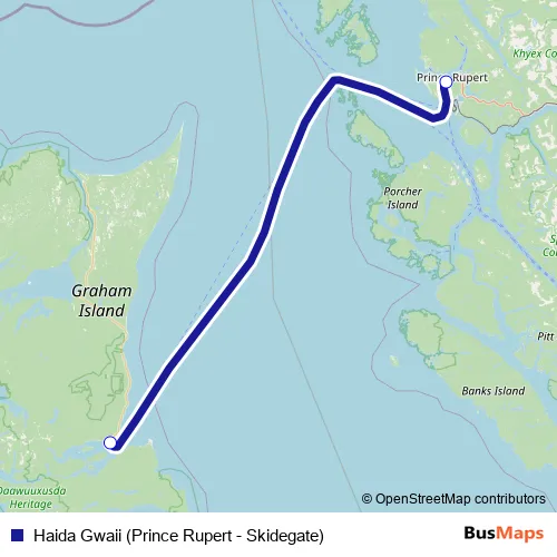 The first stop of the Haida Gwaii (Prince Rupert - Skidegate) ferry route is Skidegate (Graham Island) and the last stop is Prince Rupert. Haida Gwaii (Prince Rupert - Skidegate) (Haida Gwaii (Prince Rupert - Skidegate)) is operational during tous les jours.