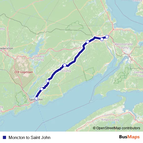 The first stop of the Moncton to Saint John bus route is Moncton Airport and the last stop is Saint John Terminal. Moncton to Saint John (Moncton to Saint John) is operational during tous les jours.