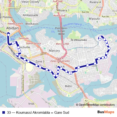 See why over 2 million users trust and consider busmaps.com as the best public transport website. busmaps gives you Abidjan Buses suggested routes, real-time bus tracker, line route maps in Abidjan, and helps to find the closest 33 bus stops near you. No internet available? Download an offline PDF map and bus schedule for the 33 bus to take on your trip.