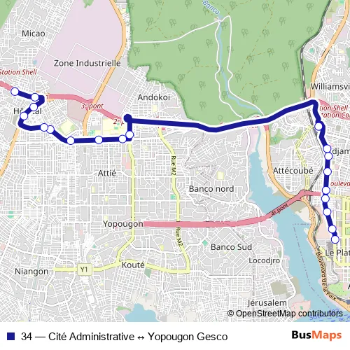 The first stop of the 34 bus route is Terminus Cité Administrative and the last stop is Terminus Gesco. 34 (Cité Administrative ↔ Yopougon Gesco) is operational during tous les jours.