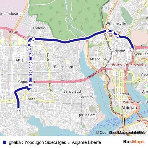 gbaka : Yopougon Sideci Iges ↔ Adjamé Liberté bus Route Map