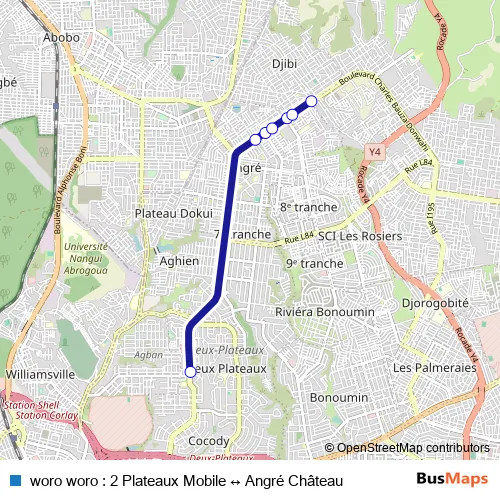 Additional information: woro woro : 2 Plateaux Mobile ↔ Angré Château has 7 stops and the total trip duration
