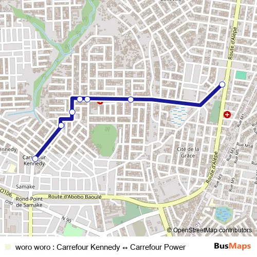 See why over 2 million users trust and consider busmaps.com as the best public transport website. busmaps gives you Abidjan Buses suggested routes, real-time bus tracker, line route maps in Abidjan, and helps to find the closest woro woro : Carrefour Kennedy ↔ Carrefour Power bus stops near you. No internet available? Download an offline PDF map and bus schedule for the woro woro : Carrefour Kennedy ↔ Carrefour Power bus to take on your trip.
