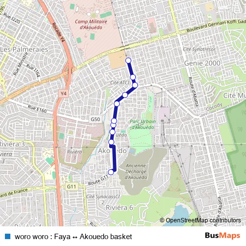 The first stop of the woro woro : Faya ↔ Akouedo basket bus route is Akouédo basket and the last stop is
