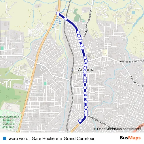 The first stop of the woro woro : Gare Routière ↔ Grand Carrefour bus route is Gare d'Anyama and the last stop is Grand carrefour. woro woro : Gare Routière ↔ Grand Carrefour (woro woro : Gare Routière ↔ Grand Carrefour) is operational during tous les jours.