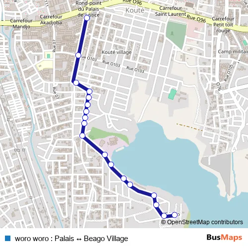 The first stop of the woro woro : Palais ↔ Beago Village bus route is Beago Village and the last stop is Palais de justice. woro woro : Palais ↔ Beago Village (woro woro : Palais ↔ Beago Village) is operational during tous les jours.
