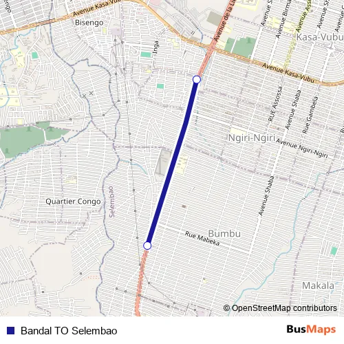 See why over 2 million users trust and consider busmaps.com as the best public transport website. busmaps gives you Kinshasa Buses suggested routes, real-time bus tracker, line route maps in Kinshasa, and helps to find the closest Bandal TO Selembao bus stops near you. No internet available? Download an offline PDF map and bus schedule for the Bandal TO Selembao bus to take on your trip.