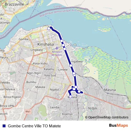 Additional information: Gombe Centre Ville TO Matete has 12 stops and the total trip duration for this route is approximately 21 minutes.