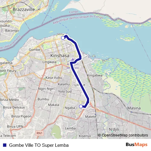 See why over 2 million users trust and consider busmaps.com as the best public transport website. busmaps gives you Kinshasa Buses suggested routes, real-time bus tracker, line route maps in Kinshasa, and helps to find the closest Gombe Ville TO Super Lemba bus stops near you. No internet available? Download an offline PDF map and bus schedule for the Gombe Ville TO Super Lemba bus to take on your trip.