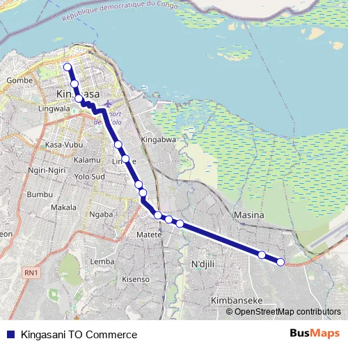 See why over 2 million users trust and consider busmaps.com as the best public transport website. busmaps gives you Kinshasa Buses suggested routes, real-time bus tracker, line route maps in Kinshasa, and helps to find the closest Kingasani TO Commerce bus stops near you. No internet available? Download an offline PDF map and bus schedule for the Kingasani TO Commerce bus to take on your trip.