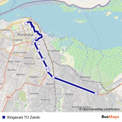 See why over 2 million users trust and consider busmaps.com as the best public transport website. busmaps gives you Kinshasa Buses suggested routes, real-time bus tracker, line route maps in Kinshasa, and helps to find the closest Kingasani TO Zando bus stops near you. No internet available? Download an offline PDF map and bus schedule for the Kingasani TO Zando bus to take on your trip.