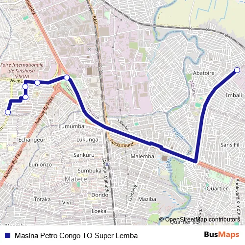 See why over 2 million users trust and consider busmaps.com as the best public transport website. busmaps gives you Kinshasa Buses suggested routes, real-time bus tracker, line route maps in Kinshasa, and helps to find the closest Masina Petro Congo TO Super Lemba bus stops near you. No internet available? Download an offline PDF map and bus schedule for the Masina Petro Congo TO Super Lemba bus to take on your trip.