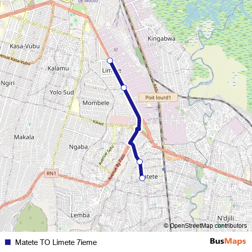 See why over 2 million users trust and consider busmaps.com as the best public transport website. busmaps gives you Kinshasa Buses suggested routes, real-time bus tracker, line route maps in Kinshasa, and helps to find the closest Matete TO Limete 7ieme bus stops near you. No internet available? Download an offline PDF map and bus schedule for the Matete TO Limete 7ieme bus to take on your trip.