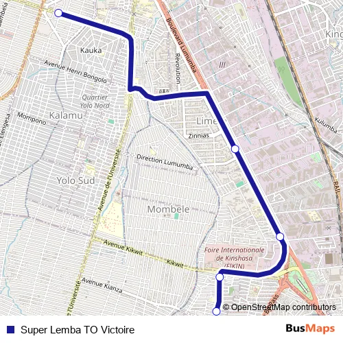 See why over 2 million users trust and consider busmaps.com as the best public transport website. busmaps gives you Kinshasa Buses suggested routes, real-time bus tracker, line route maps in Kinshasa, and helps to find the closest Super Lemba TO Victoire bus stops near you. No internet available? Download an offline PDF map and bus schedule for the Super Lemba TO Victoire bus to take on your trip.
