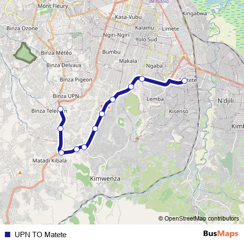 See why over 2 million users trust and consider busmaps.com as the best public transport website. busmaps gives you Kinshasa Buses suggested routes, real-time bus tracker, line route maps in Kinshasa, and helps to find the closest UPN TO Matete bus stops near you. No internet available? Download an offline PDF map and bus schedule for the UPN TO Matete bus to take on your trip.
