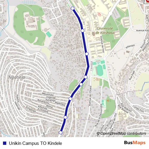 See why over 2 million users trust and consider busmaps.com as the best public transport website. busmaps gives you Kinshasa Buses suggested routes, real-time bus tracker, line route maps in Kinshasa, and helps to find the closest Unikin Campus TO Kindele bus stops near you. No internet available? Download an offline PDF map and bus schedule for the Unikin Campus TO Kindele bus to take on your trip.