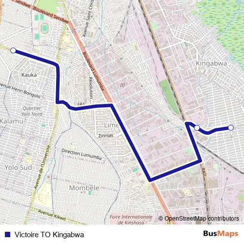 See why over 2 million users trust and consider busmaps.com as the best public transport website. busmaps gives you Kinshasa Buses suggested routes, real-time bus tracker, line route maps in Kinshasa, and helps to find the closest Victoire TO Kingabwa bus stops near you. No internet available? Download an offline PDF map and bus schedule for the Victoire TO Kingabwa bus to take on your trip.