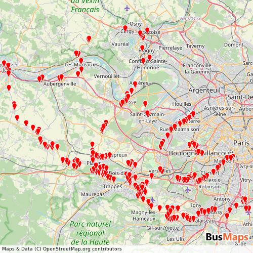 Lignes Île-de-France Ouest operates in the following cities: Versailles, Pontoise, Plaisir, Aubergenville, Mantes-la-Jolie, Nanterre, Neauphle-le-Chateau.