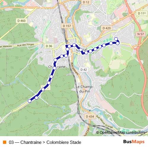 The first stop of the 03 bus route is Chantraine Terminus and the last stop is Colombiere Stade. 03 (Chantraine > Colombiere Stade) is operational during tous les jours.