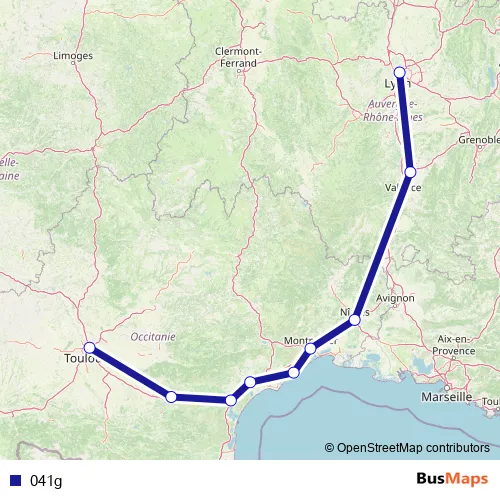 The first stop of the 041g rail route is Lyon Part Dieu and the last stop is Toulouse-Matabiau. 041g is operational during tous les jours.