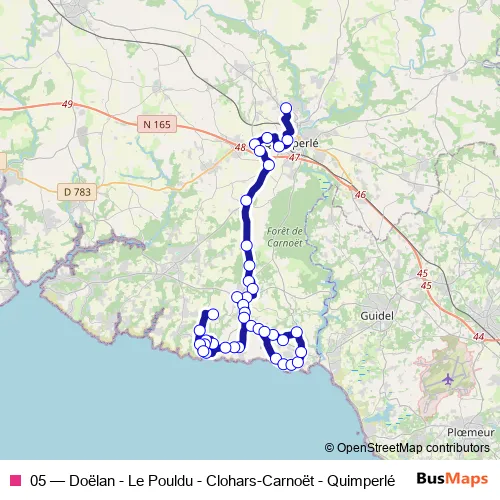See why over 2 million users trust and consider busmaps.com as the best public transport website. busmaps gives you Clohars-Carnoet Buses suggested routes, real-time bus tracker, line route maps in Clohars-Carnoet, and helps to find the closest 05 bus stops near you. No internet available? Download an offline PDF map and bus schedule for the 05 bus to take on your trip.