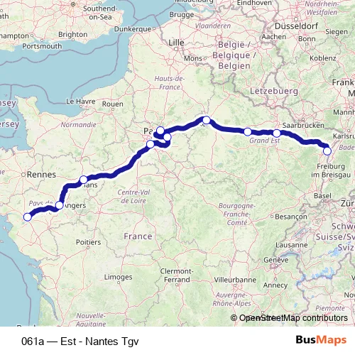 The first stop of the 061a rail route is Nantes and the last stop is Strasbourg. 061a (Est - Nantes Tgv) is operational during tous les jours.