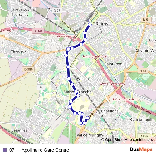 See why over 2 million users trust and consider busmaps.com as the best public transport website. busmaps gives you Reims Buses suggested routes, real-time bus tracker, line route maps in Reims, and helps to find the closest 07 bus stops near you. No internet available? Download an offline PDF map and bus schedule for the 07 bus to take on your trip.