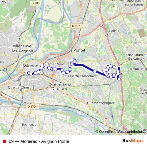 The first stop of the 09 bus route is Avignon Poste and the last stop is Collège Anne Frank. 09 (Morieres - Avignon Poste) is operational during tous les jours.