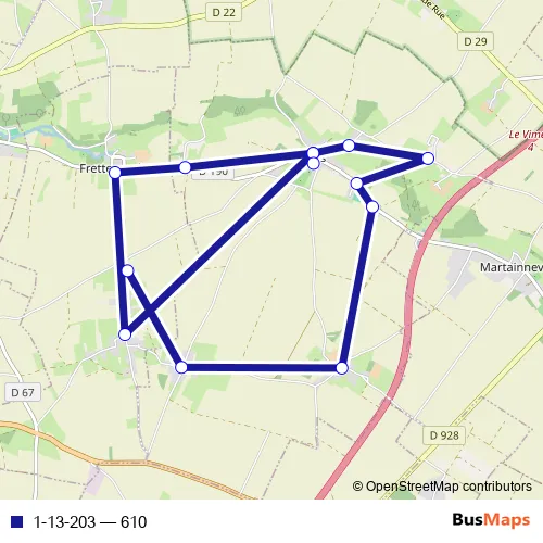 The first stop of the 1-13-203 bus route is Frettemeule - Maigneville - Ecole and the last stop is Vismes - Ecole. 1-13-203 (610) is operational during tous les jours.