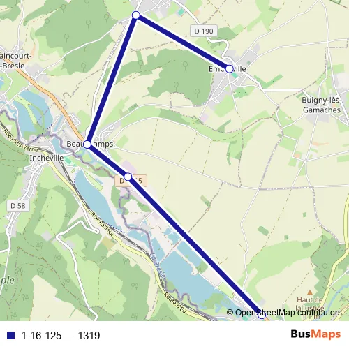The first stop of the 1-16-125 bus route is Embreville - Ecole and the last stop is Gamaches - Collège Louis Jouvet. 1-16-125 (1319) is operational during tous les jours.