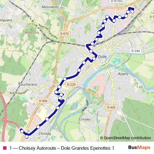 The first stop of the 1 bus route is Grandes Epenottes and the last stop is Choisey Autoroute. 1 (Choisey Autoroute – Dole Grandes Epenottes 1) is operational during tous les jours.
