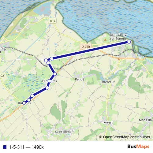 The first stop of the 1-5-311 bus route is Saint-Valery-SUR-Somme - Collège de la Baie de Somme and the last stop is Brutelles - Mairie Ecole. 1-5-311 (1490k) is operational during tous les jours.