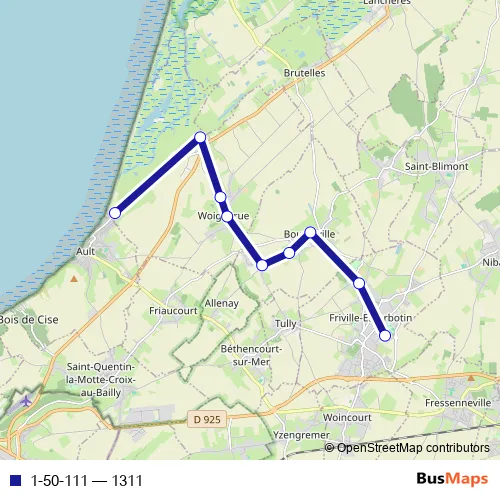 The first stop of the 1-50-111 bus route is Woignarue - Onival - terrain boules and the last stop is Friville-Escarbotin - Lycée du Vimeu - Cité scolaire. 1-50-111 (1311) is operational during en semaine.
