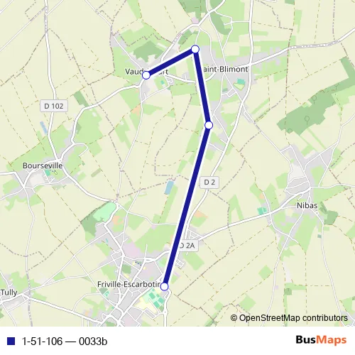 The first stop of the 1-51-106 bus route is Vaudricourt - Place de l'Eglise and the last stop is Friville-Escarbotin - Collège La Rose des Vents. 1-51-106 (0033b) is operational during en semaine.