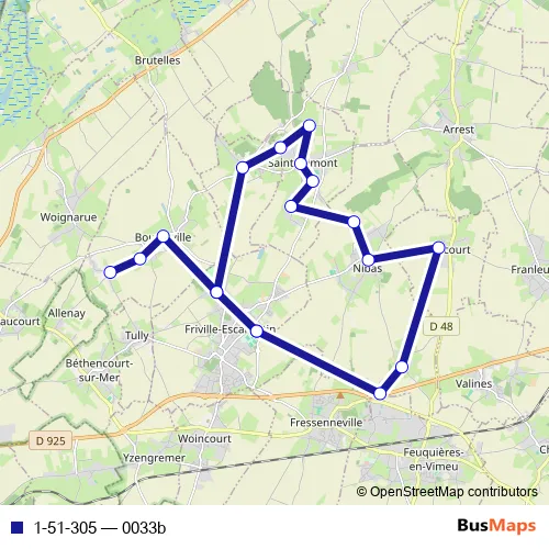 The first stop of the 1-51-305 bus route is Friville-Escarbotin - Collège La Rose des Vents and the last stop is Bourseville - Martaigneville. 1-51-305 (0033b) is operational during tous les jours.