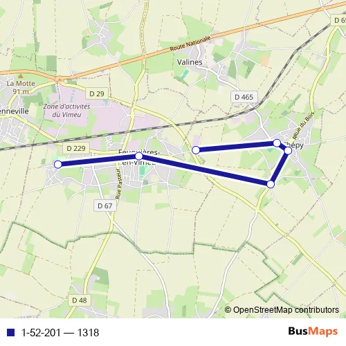 The first stop of the 1-52-201 bus route is Feuquieres-EN-Vimeu - Collège Segpa Gaston Vasseur and the last stop is Chepy - Les Hayettes. 1-52-201 (1318) is operational during tous les jours.