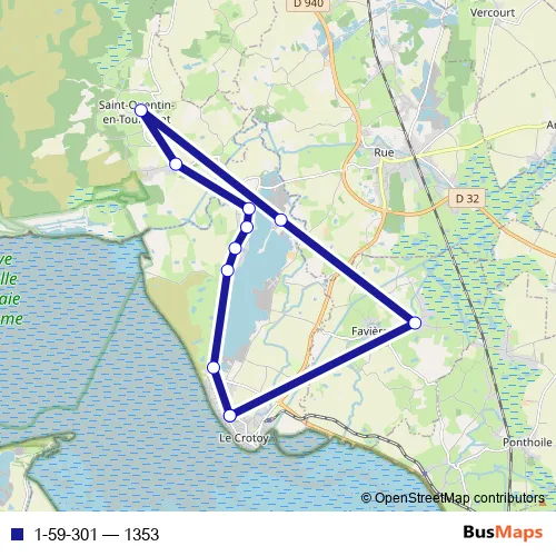 The first stop of the 1-59-301 bus route is LE Crotoy - Ecole and the last stop is LE Crotoy - Ecole. 1-59-301 (1353) is operational during tous les jours.