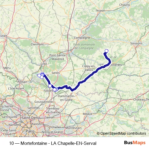 The first stop of the 10 bus route is Mairie and the last stop is Chantilly.Carrefour Market. 10 (Mortefontaine - LA Chapelle-EN-Serval) is operational during en semaine.