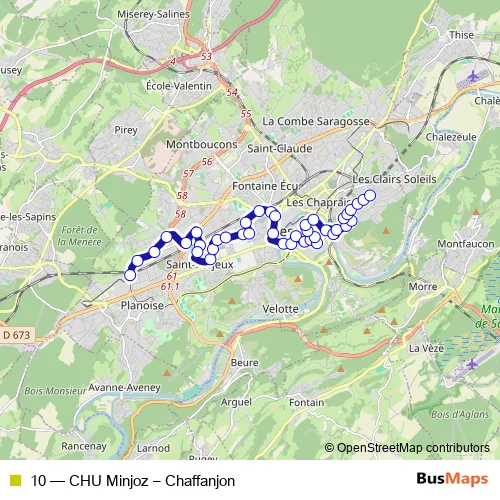 The first stop of the 10 bus route is CHU Minjoz and the last stop is Chaffanjon. 10 (CHU Minjoz – Chaffanjon) is operational during tous les jours.