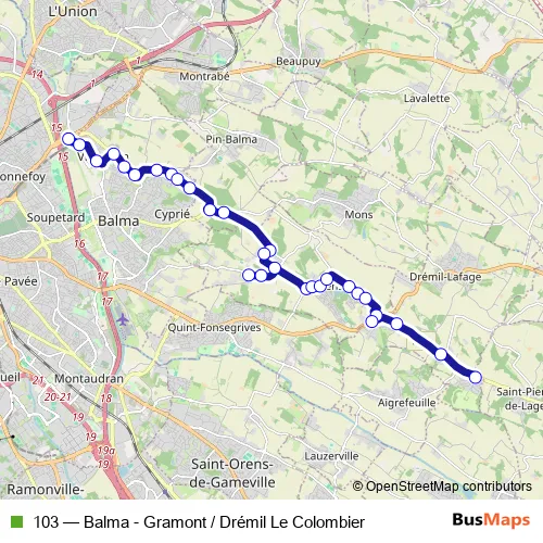The first stop of the 103 bus route is Balma-Gramont and the last stop is Drémil Le Colombier. 103 (Balma - Gramont / Drémil Le Colombier) is operational during tous les jours.