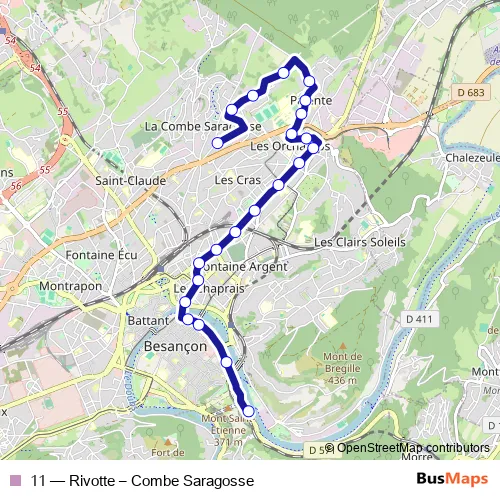 The first stop of the 11 bus route is Combe Saragosse and the last stop is Rivotte. 11 (Rivotte – Combe Saragosse) is operational during tous les jours.
