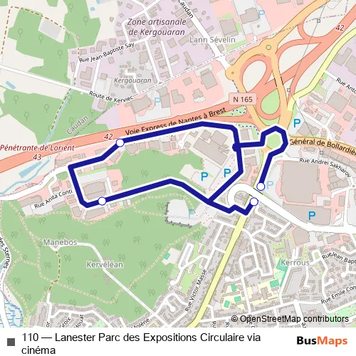 Bus 110 - Lanester Parc des Expositions Circulaire via cinéma in Lorient: Stops & Timetable