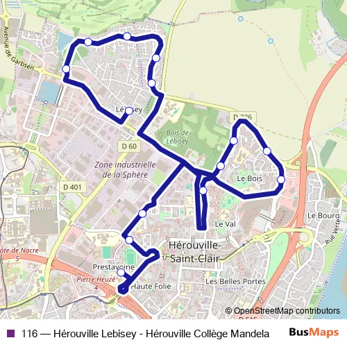 The first stop of the 116 bus route is Collège Mandela and the last stop is Lebisey. 116 (Hérouville Lebisey - Hérouville Collège Mandela) is operational during en semaine.