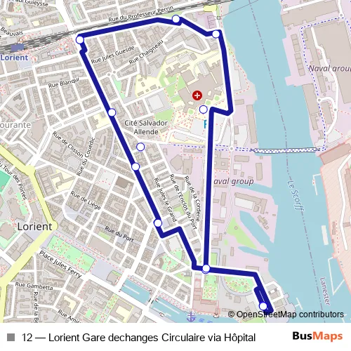 Click here to view the nearest 12 - Lorient Gare dechanges Circulaire via Hôpital bus stop.