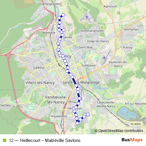 The first stop of the 12 bus route is Heillecourt and the last stop is Malzéville. 12 (Heillecourt – Malzéville Savlons) is operational during tous les jours.