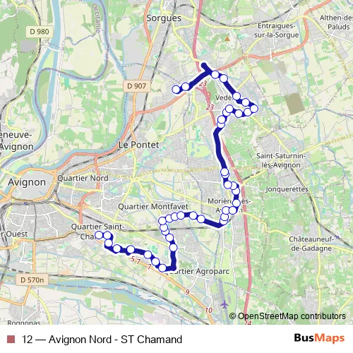 The first stop of the 12 bus route is St Chamand and the last stop is Newton Avi Nord. 12 (Avignon Nord - ST Chamand) is operational during tous les jours.