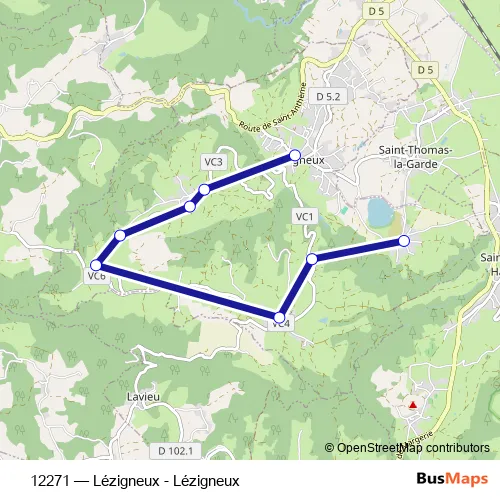 The first stop of the 12271 bus route is Bourg Abribus and the last stop is Vidrieux. 12271 (Lézigneux - Lézigneux) is operational during en semaine.